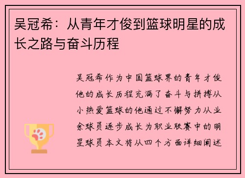 吴冠希:从青年才俊到篮球明星的成长之路与奋斗历程