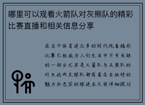 哪里可以观看火箭队对灰熊队的精彩比赛直播和相关信息分享