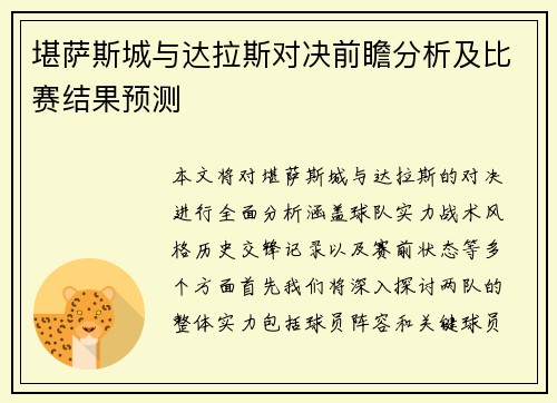 堪萨斯城与达拉斯对决前瞻分析及比赛结果预测