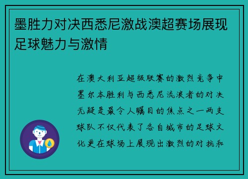 墨胜力对决西悉尼激战澳超赛场展现足球魅力与激情