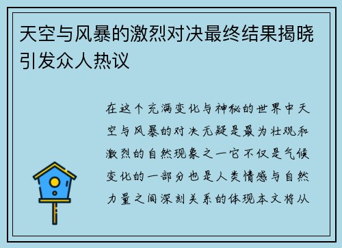 天空与风暴的激烈对决最终结果揭晓引发众人热议